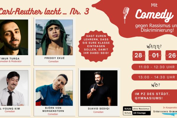 „Carl Reuther lacht Nr. 3″ – am Mittwoch, den 28. Januar 2026 werden wir wieder Comedy gegen Diskriminierung und Rassismus erleben. Dieses Mal mit den Comedia…