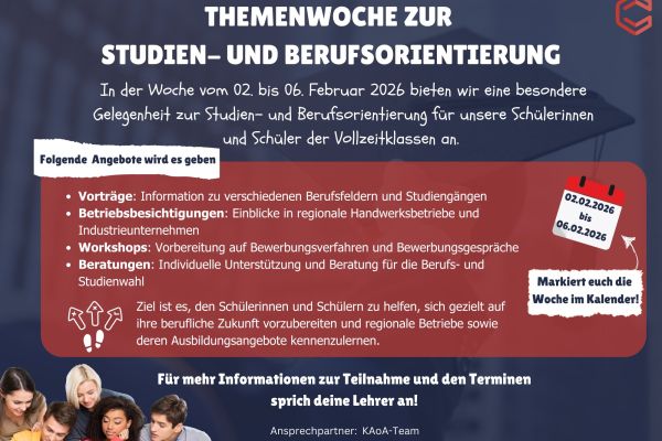 In der Woche vom 02. bis 06. Februar 2026 bieten wir eine besondere Gelegenheit zur Studien- und Berufsorientierung für unsere Schülerinnen und Schüler der Vo…
