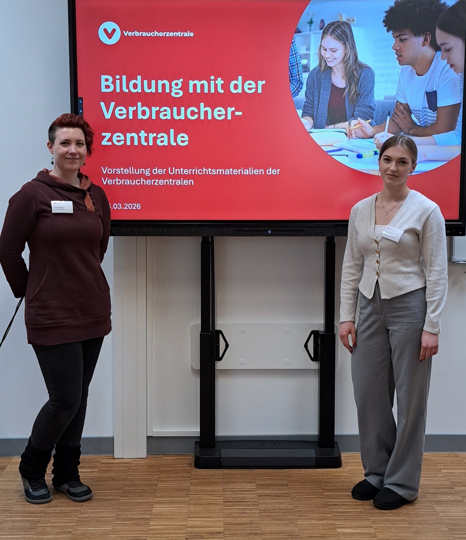 Da die Bildungstrainer der Verbraucherzentrale aus finanziellen Gründen leider nicht mehr zur Schule kommen können, hatte Eva Dernóczi daraufhin für 25 interessierte Lehrkräfte eine Fortbildung der Verbraucherzentrale organisiert, die von Nicola Kleimann durchgeführt wurde. Sie arbeitet als wissenschaftliche Mitarbeiterin bei der Verbraucherzentrale NRW e.V. in Düsseldorf und war am Donnerstag, den 26. März 2026 bei uns, damit wir uns noch einmal die Brille der Lernenden aufsetzen. Wir konnten Unterrichtsmaterialien ausprobierten und bearbeiteten, die sich mit den oben genannten Fragen auseinandersetzen.