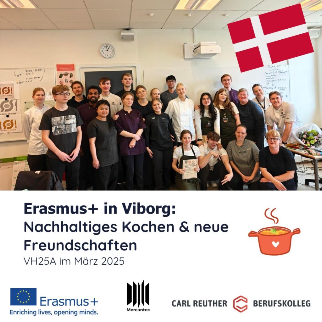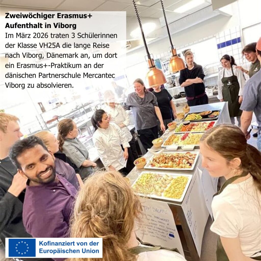 Im März 2026 traten 3 Schülerinnen der Klasse VH25A die lange Reise nach Viborg, Dänemark an, um dort ein Erasmus+-Praktikum an der dänischen Partnerschule Mercantec Viborg zu absolvieren. Die Schülerinnen erhielten spannende Einblicke in Praxis- und Theorieunterricht mit dem Schwerpunkt „ökologische Menüplanung“ und verglichen ökologisch und konventionell hergestellte Nahrungsmittel miteinander. Viele gemeinsame Essen und ein Ausflug zur food expo Herning, der größten Gastronomiemesse in Dänemark, rundeten das Programm ab.