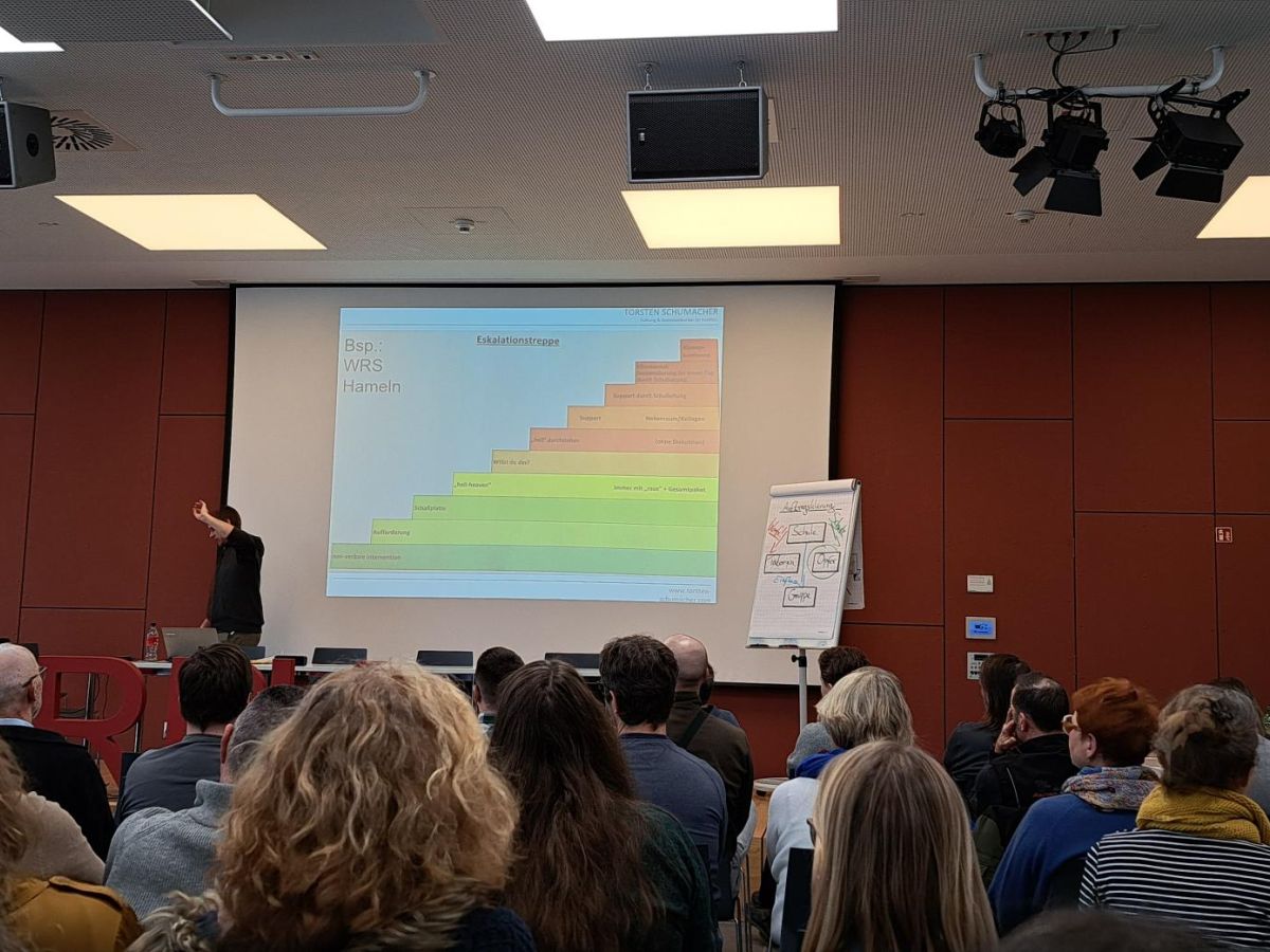 Zu Tagesbeginn stellte das Krisenteam seine aktuellen Mitglieder und Arbeitsergebnisse zum Umgang mit Krisen am CRBK vor. Anschließend ging es in einem sehr anschaulichen Impulsvortrag des Referenten vom Deutschen Institut für konfrontative Pädagogik Benjamin Pohl um Grundlagen und Vorgehensweisen in Bezug auf herausforderndes Verhalten im schulischen Kontext.