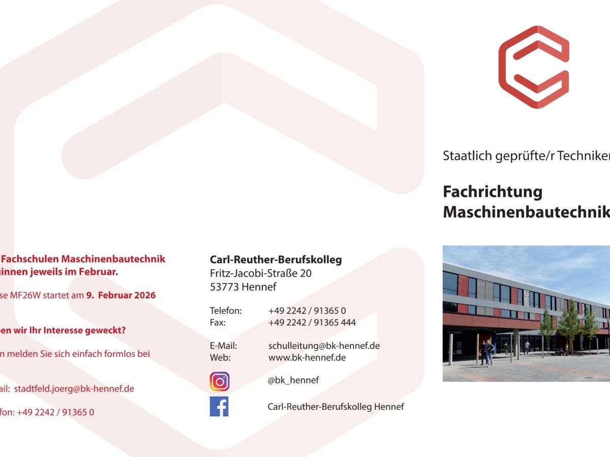 Der aktuelle Infoflyer für die Fachschulen Maschinenbautechnik und Elektrotechnik ist ab sofort erhältlich! Er bietet einen übersichtlichen Einblick in Ausbildungsinhalte, Schwerpunkte und organisatorische Rahmenbedingungen. Perfekt, um sich schnell und gezielt über das Angebot der Fachschulen zu informieren.