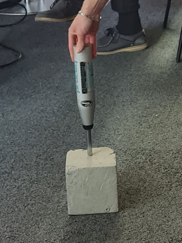 Wir mussten selbst aktiv werden: Durch das Anheben von Probewürfeln konnten wir direkt erfahren, warum Strahlenschutzbeton (der Stahlkugeln enthält) deutlich schwerer ist als herkömmlicher Beton. Wir lernten auch verschiedene Prüfverfahren kennen, darunter den Rückprallhammers und die Humm-Sonde zur Qualitätskontrolle von Beton und das magnetinduktive Detektionssystem (Ferroscan) zur Ermittlung von Lage, Tiefe und Durchmesser der Bewehrung in Betondecken. Das ist wichtig, um die Standfestigkeit eines Gebäudes zu prüfen.