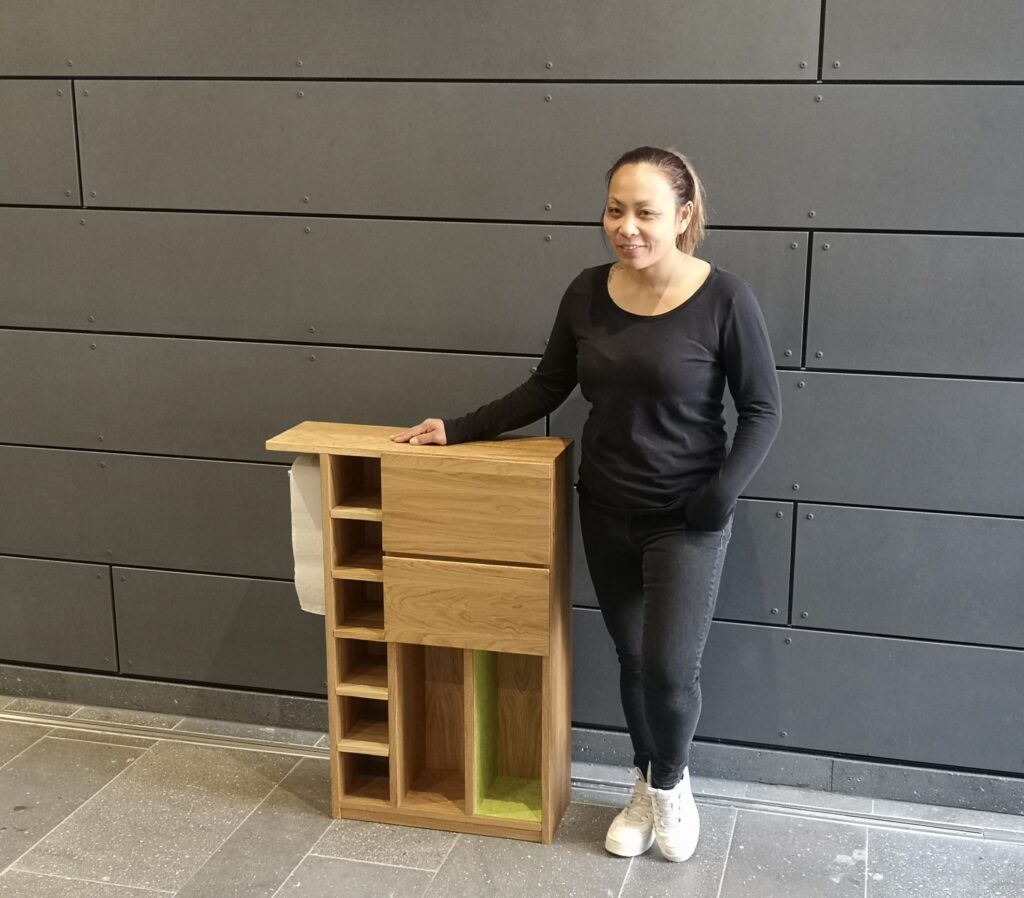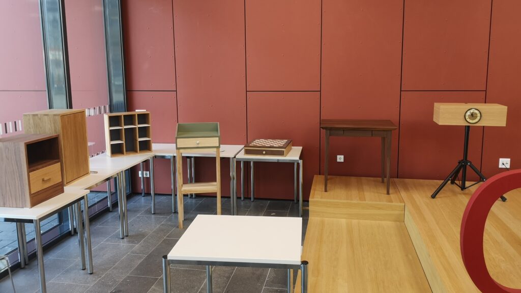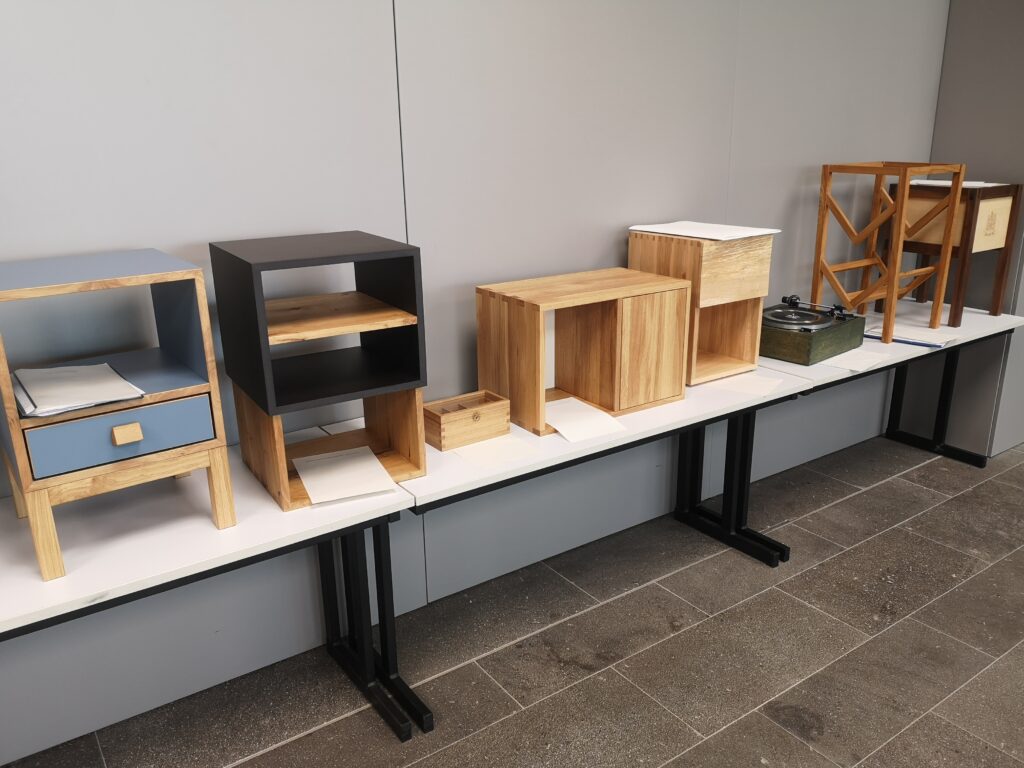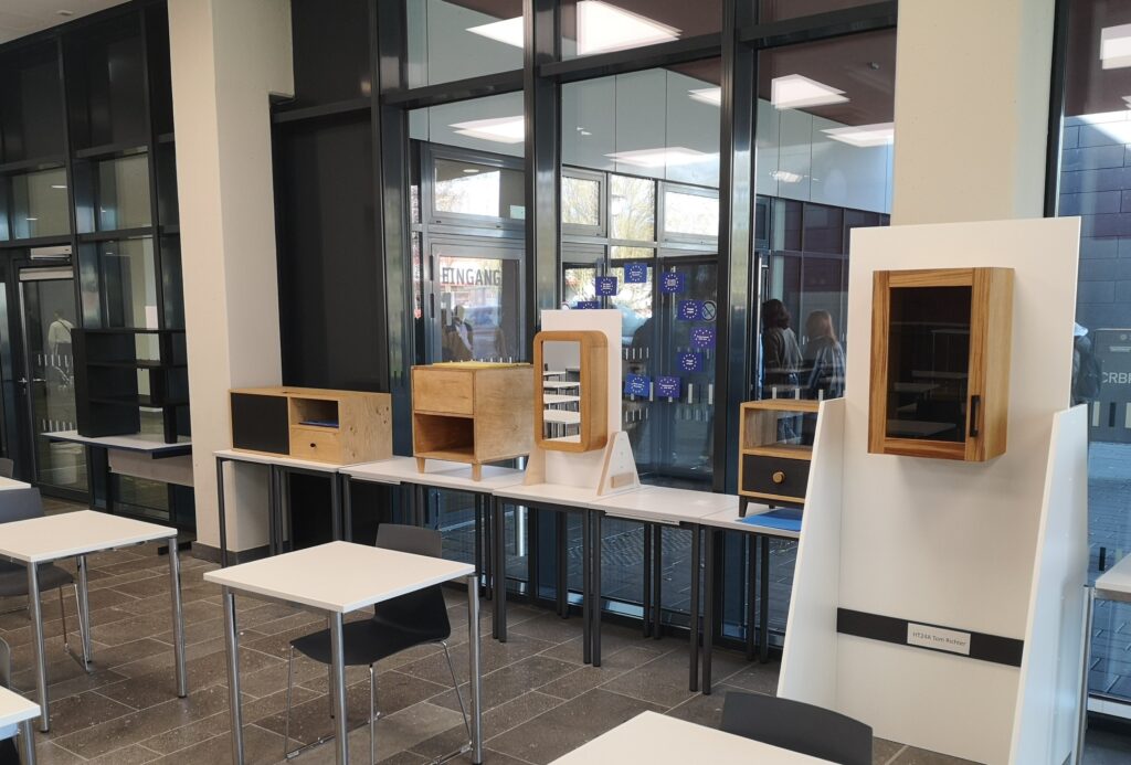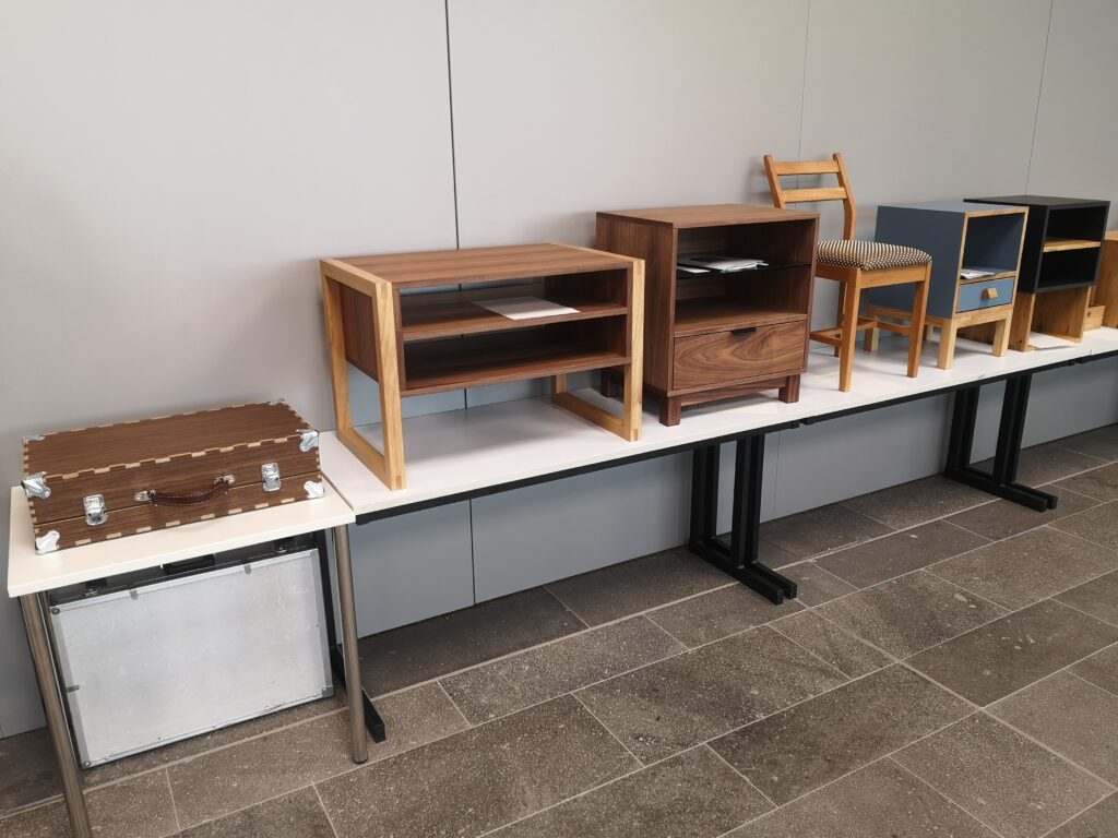 Zwei Wochen lang lief die Ausstellung der fertigen Kleinmöbel in der Aula des CRBK und fand viel Resonanz seitens der Mitschüler*innen und Kolleg*innen; es kam sogar zu Kaufangeboten – ein sicheres Zeichen dafür, dass man sich mit der Ausbildung zur Tischler*in auf einem guten Weg in Richtung Zukunft befindet.