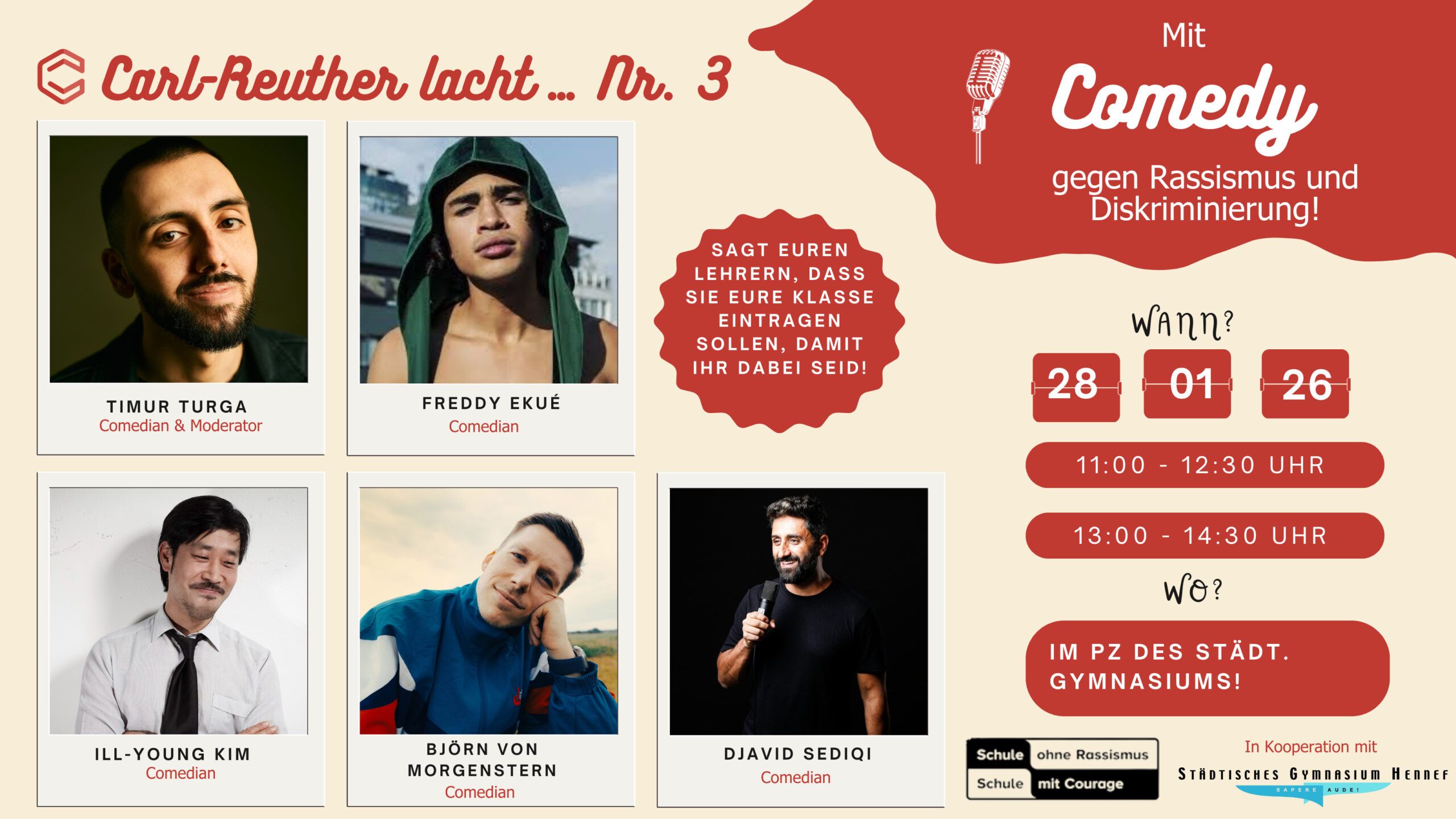 „Carl Reuther lacht Nr. 3″ – am Mittwoch, den 28. Januar 2026 werden wir wieder Comedy gegen Diskriminierung und Rassismus erleben. Dieses Mal mit den Comedians Ill-Young Kim, Djavid Sediqi, Björn von Morgenstern, Freddy Ekué und unserem Courage-Paten und Comedian Timur Turga. Alle sind bereits durch TV-Formate wie „Quatsch Comedy Club“, “Nightwash“ oder dem Kölner Comedy Festival bekannt. Als Courage-Schule kann man auch mal mit Humor „Vorurteile und Diskriminierun-gen“ betrachten. Es geht darum, humorvoll Stereotype zu hinterfragen, Klischees und Vorurteile ab-zubauen. Der evangelische Kirchenkreis „An Sieg und Rhein“ unterstützt die Veranstaltung finanziell, um sich gemeinsam mit dem Rhein-Sieg-Kreis gegen Rassismus und Diskriminierungen stark zu ma-chen. Das Ganze findet in Kooperation mit dem Städtischen Gymnasium im Pädagogischen Zentrum statt, direkt neben unserem Berufskolleg.