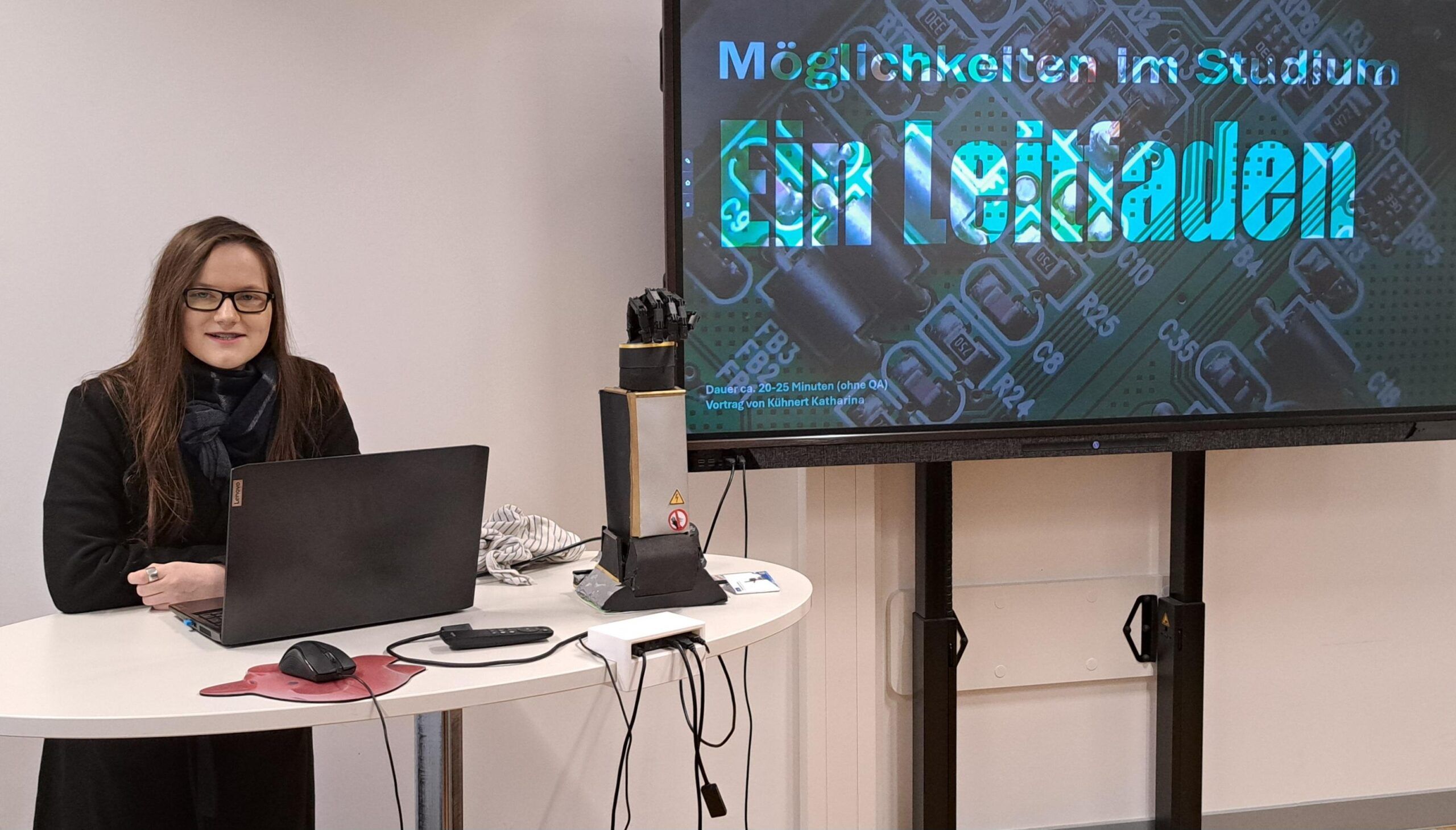 Über zahlreiche QR‑Codes konnten wir sofort auf weiterführende Informationen zugreifen – darunter z.B. Links zur Studienberatung, zum offiziellen BAföG‑Rechner sowie zu Beispielprojekten aus dem Informatikstudium. So hatten alle Teilnehmenden die Möglichkeit, sich auch im Nachgang individuell und vertiefend mit den Themen auseinanderzusetzen. „Der Vortrag bot eine gelungene Mischung aus persönlicher Erfahrung, hilfreichen Tipps und konkreten Orientierungshilfen“, so Claas (IH24A). Sie zeigte anschaulich und konkret als Beispiel ihre Projektarbeit über eine „Fuduino-basierte Roboterhand. Katharinas Präsentation empfand die Klasse als gut strukturiert, man merkte, dass sie sich sehr viel Mühe gemacht hatte, weil ihre Folien visuell gut gestaltet waren und man viele Rückfragen an sie stellen konnte. Sinan (IH24A) fand Katharinas Vortrag hilfreich, weil er so erste Einblicke auch in den praktischen Teil des Studiums bekommen hatte, „ihr Projekt mit der Roboterhand fand ich gut und auch, dass man ihre Dokumentation als Heft ansehen konnte. Bislang war ich von solchen Projektarbeiten eher eingeschüchtert, aber es wirkte so, als sei Vieles doch machbar, es hat mir Mut gemacht.“