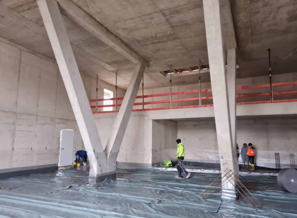 Vor Ort erklärte der Bauleiter anschaulich die Abläufe auf der Baustelle und wie wichtig eine präzise Bauzeitenplanung und die Koordination der verschiedenen Gewerke sind. Damit die Betonbauer die Bodenplatte aus Stahlfaserbeton betonieren konnten, musste das Wetter und die Arbeiten aller anderen Gewerke passen. Ein anschauliches Beispiel dafür, wie Bauabläufe auf Wetter, Nutzung und Termine abgestimmt werden müssen.
