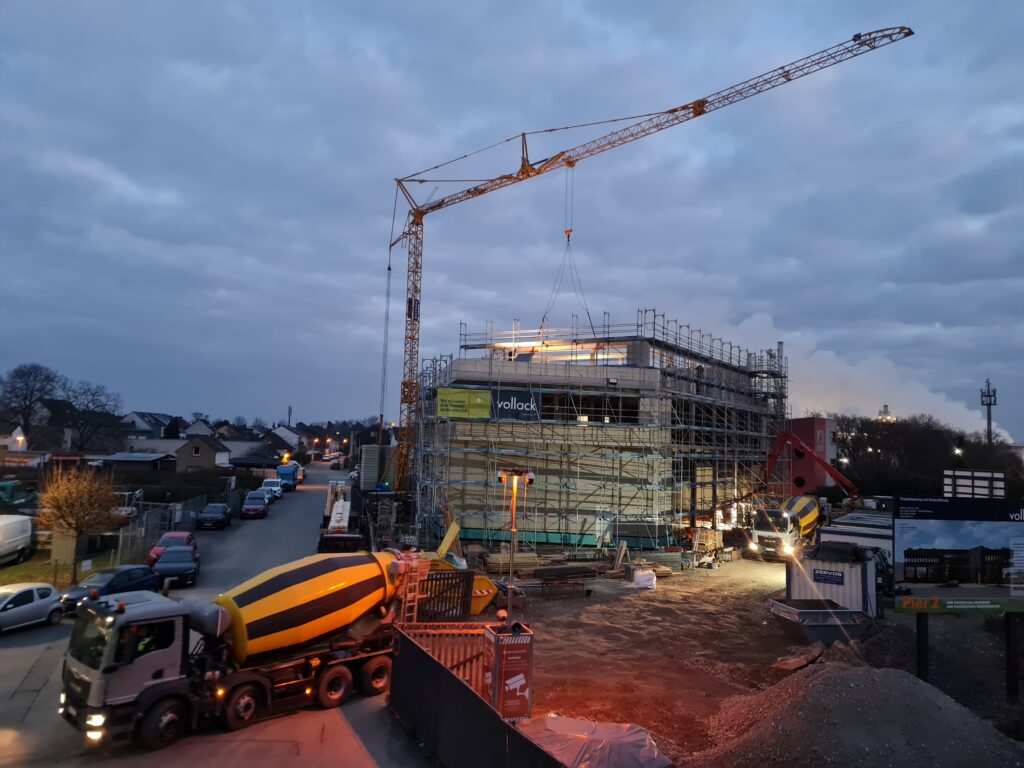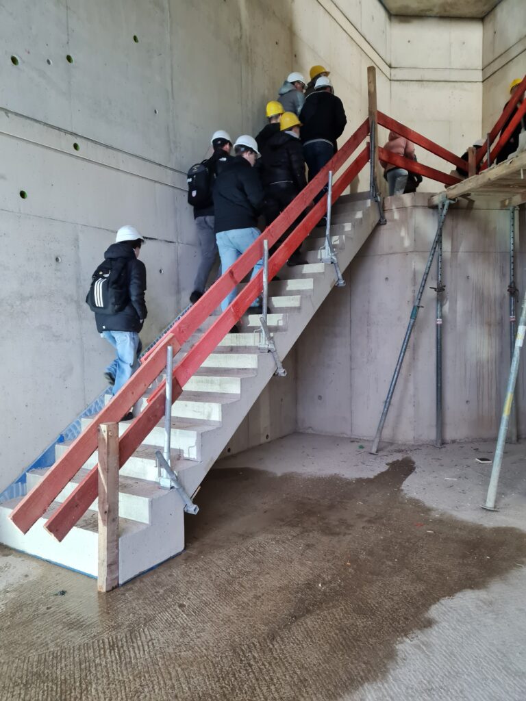 Auch besondere Bauteile wie die vor Ort geschalte und betonierte Treppe oder der Aufbau des obersten Geschosses in Holzbauweise konnten wir live miterleben. Der Einsatz des Krans, der Betonmischer, die Arbeit der Betonbauer, Zimmerer und weiterer am Bau tätige Gewerke vermittelten eindrucksvoll das Zusammenspiel moderner Bauprozesse.