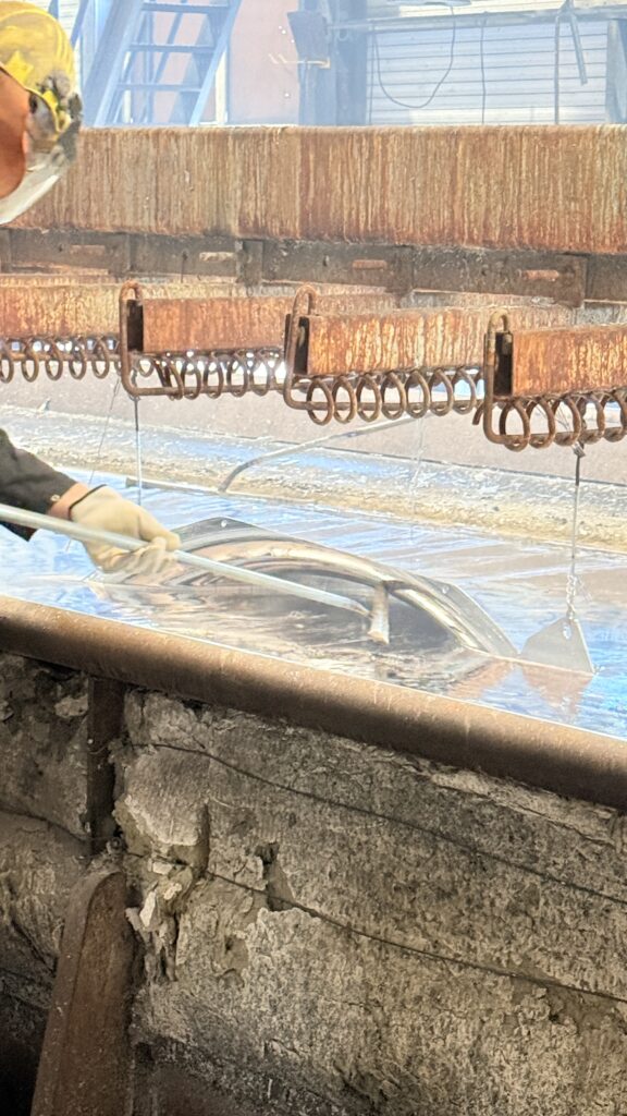 Ein weiterer Höhepunkt der Exkursion war der zweite Fachtag am Dienstagmorgen, ebenfalls bei der Firma ZINQ. Im Fokus stand das Verfahren des Feuerverzinkens. Nach einem fundierten Fachvortrag zu den physikalischen und chemischen Grundlagen des Korrosionsschutzes konnten die Teilnehmenden die praktische Umsetzung direkt in der Werkhalle beobachten. Dabei wurde deutlich, wie Metall durch das Eintauchen in flüssiges Zink dauerhaft vor Korrosion geschützt wird.