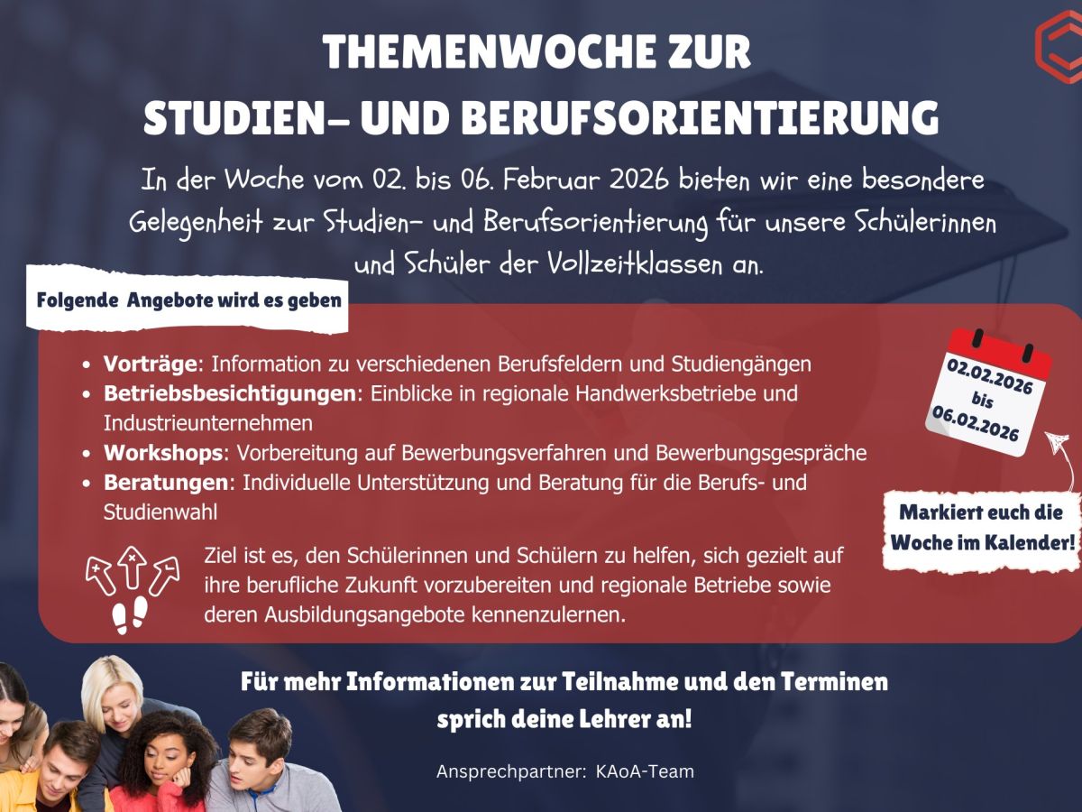 In der Woche vom 02. bis 06. Februar 2026 bieten wir eine besondere Gelegenheit zur Studien- und Berufsorientierung für unsere Schülerinnen und Schüler der Vollzeitklassen an.